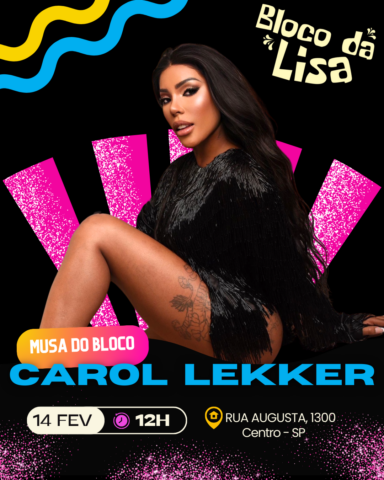 Carol Lekker está oficialmente de volta ao carnaval e já tem data e local para brilhar. A ex-participante de A Fazenda foi convidada para ser musa do Bloco da Lisa, que desfila no sábado de carnaval, dia 14, na Rua Augusta, em São Paulo.